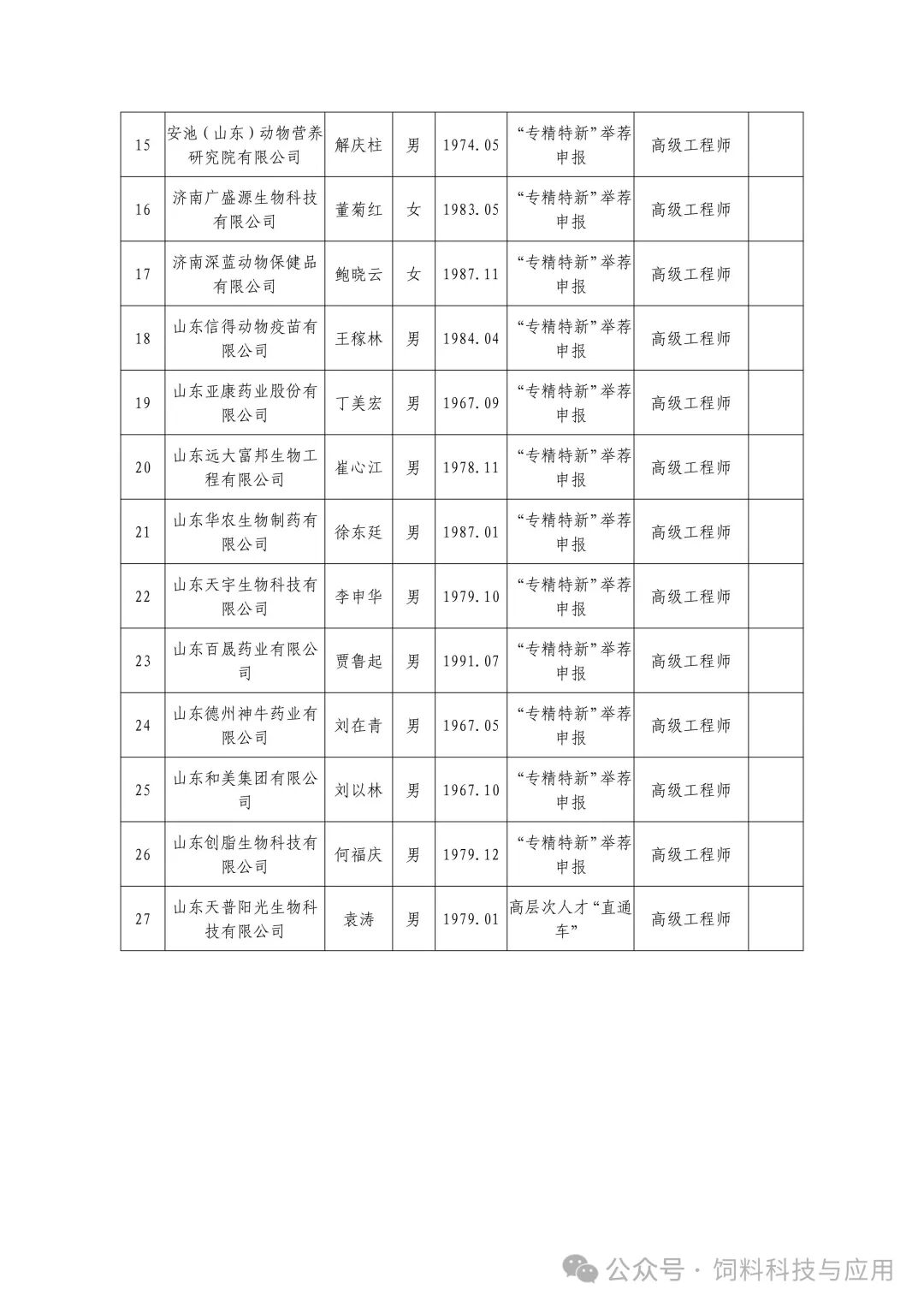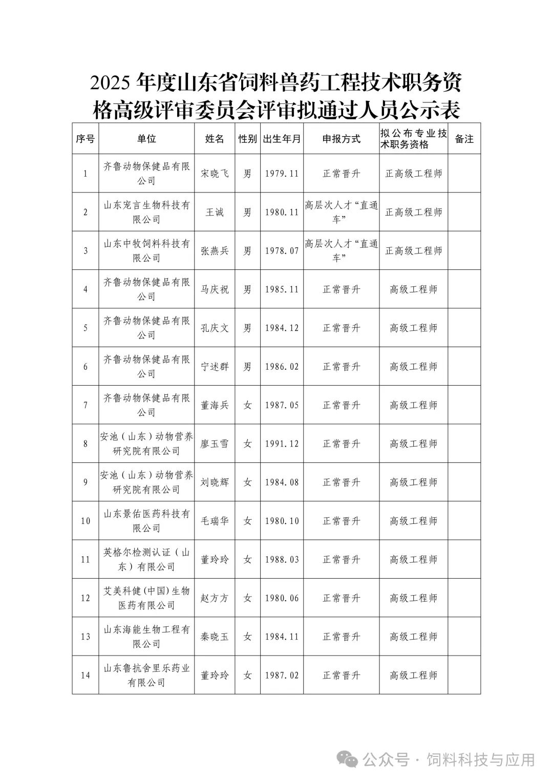 附件:2025年度山东省饲料兽药工程技术职务资格高级评审委员会评审拟通过人员公示表