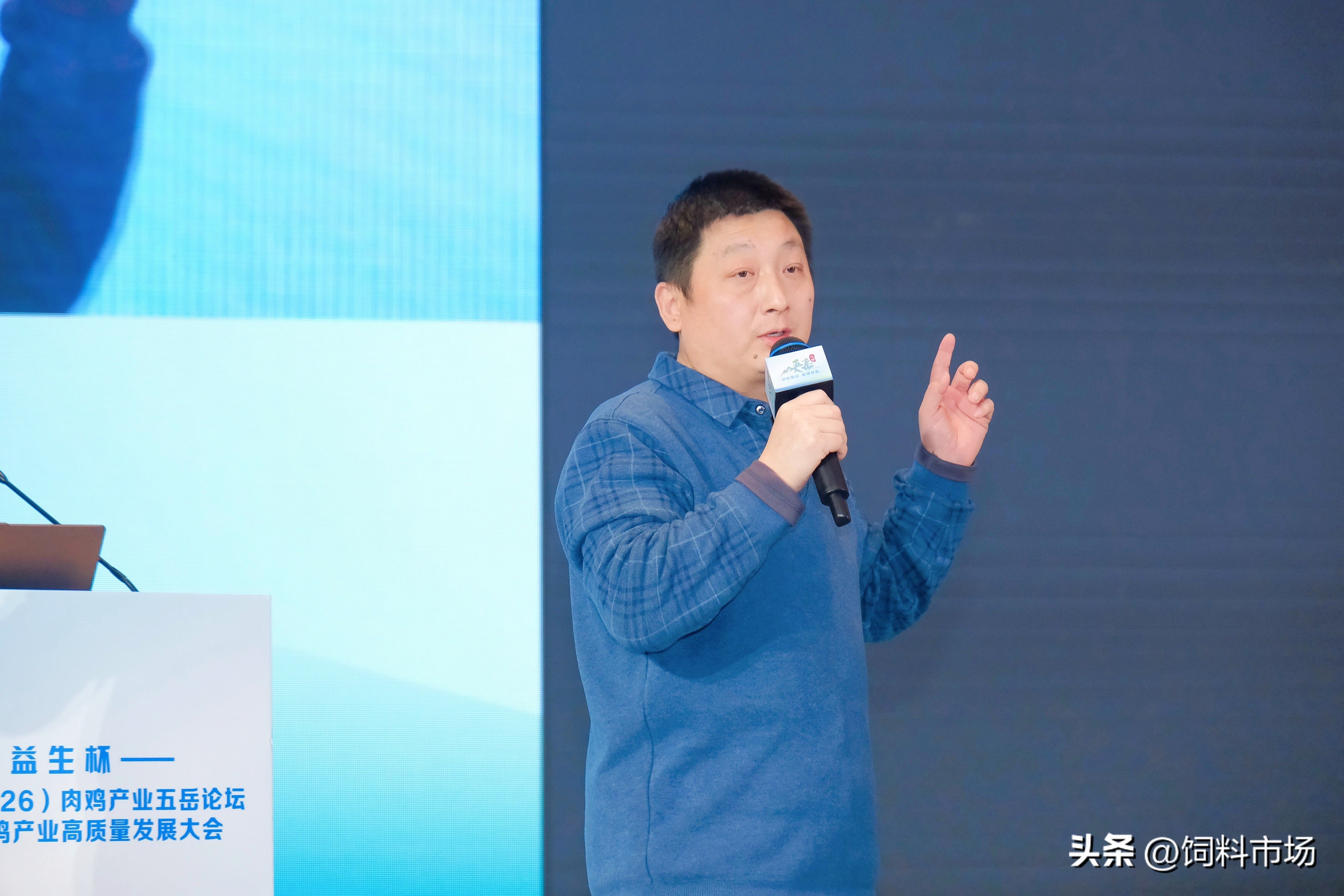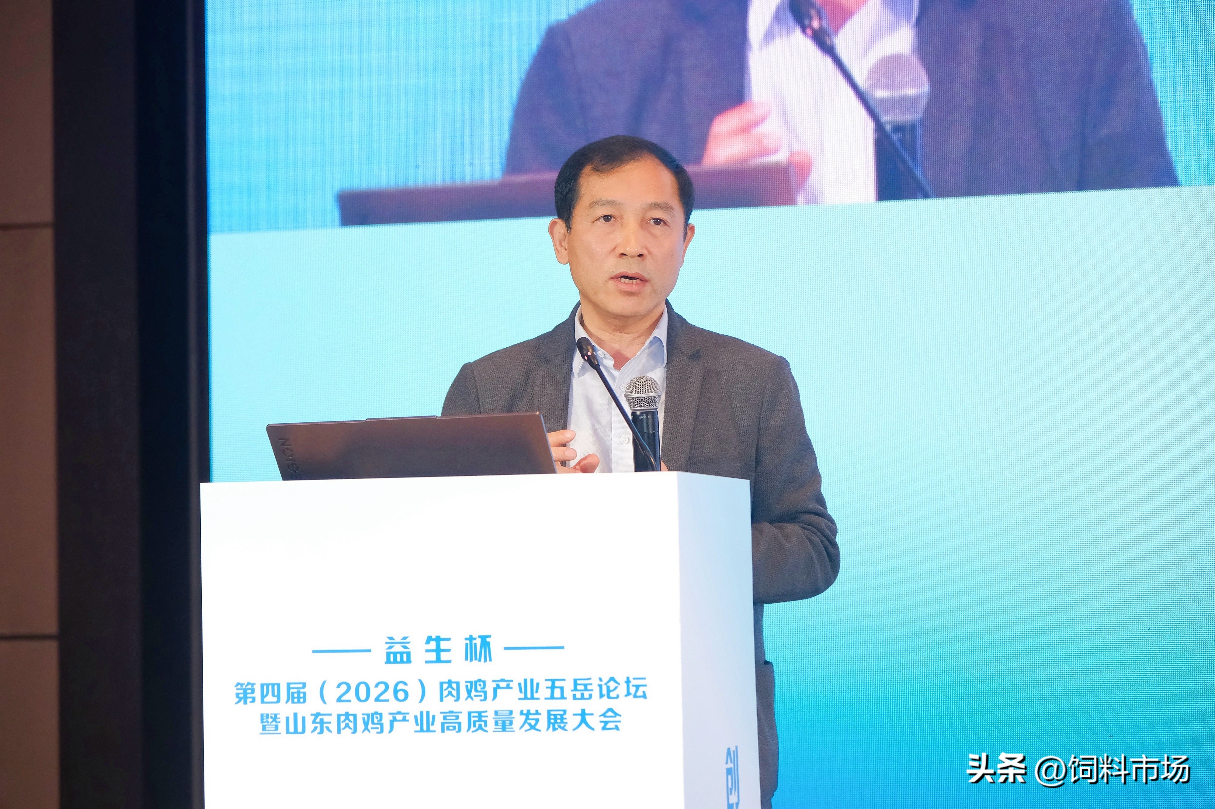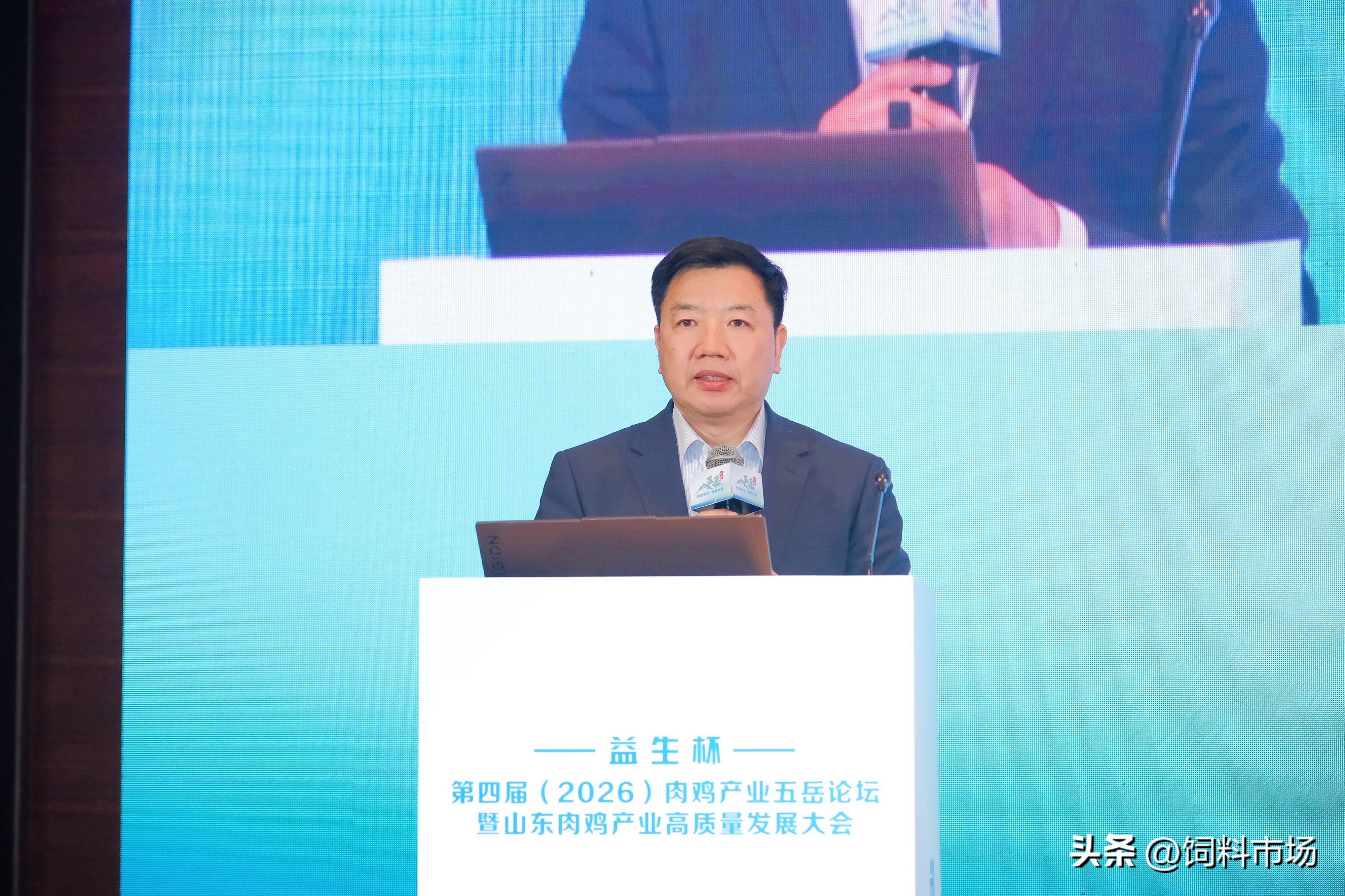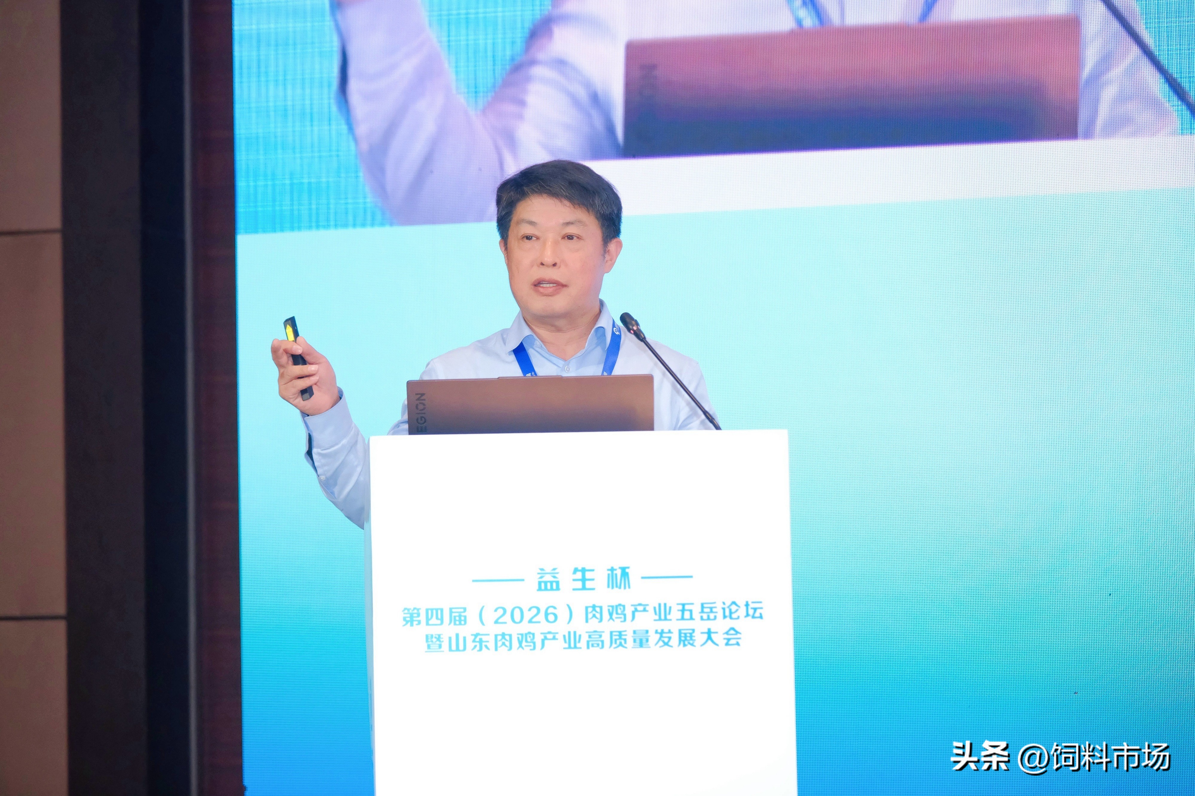 开幕式上,山东省畜牧协会会长、益生股份董事长曹积生发表致辞,他全面总结了山东肉鸡产业近年来的发展成效——2025年白羽肉鸡出栏97.5亿只,增长5.4%;加工宰杀92.86亿只,增长了6%;出栏量山东占了37%,宰杀量山东占了42.7%。从年份看,2019-2024年,猪肉消费占肉类的55%降到45%,禽肉由28%提高到37%。特别是山东,连续5年禽肉的消费超过了猪肉,去年辽宁也超过了,禽肉由原来的配角现在变成了核心引擎,拉动了整个肉类发展。他认为,肉鸡产业的增长来源于三大驱动力:第一个驱动力,《国家食品与营养纲要》已经明确提出来要扩大禽类的消费,提高禽肉的比例,已经列到了国家战略策略导向,政策很支持。第二个驱动力是最关键的,是消费驱动。消费驱动很简单:一是营养,二是价低,三是适应。营养“一高三低”,鸡肉高蛋白、低脂肪、低胆固醇、低能量现在已经深入人心,所以食用肉类的比例在大幅度地增长。第三个驱动力,首次出口量超过了进口。 展望2026年,白羽肉鸡“一紧两缺四破局”。“一紧”是什么?2025年白羽肉鸡的祖代进口量由2024年的71.15万套降到了2025年的61.76万套,降了13.5%,2026年一季度现在还没有进口的迹象,祖代鸡进口量少了很多。全国进口祖代鸡有13个祖代场,益生股份进口了26.6万套,占43.05%,后面的种鸡需求量比较紧。“两缺”,一缺好鸡苗。整个进口鸡苗的祖代少了,父母代就会少,鸡苗就会少,所有的鸡苗可能不会缺,但是进口鸡苗量比较缺,进口总鸡苗会缺点。第二个缺,据统计数据看,2026年宰杀规模比原来增加了14个亿,宰杀的规模大了,养殖供应有缺少,会出现缺鸡的现象。
