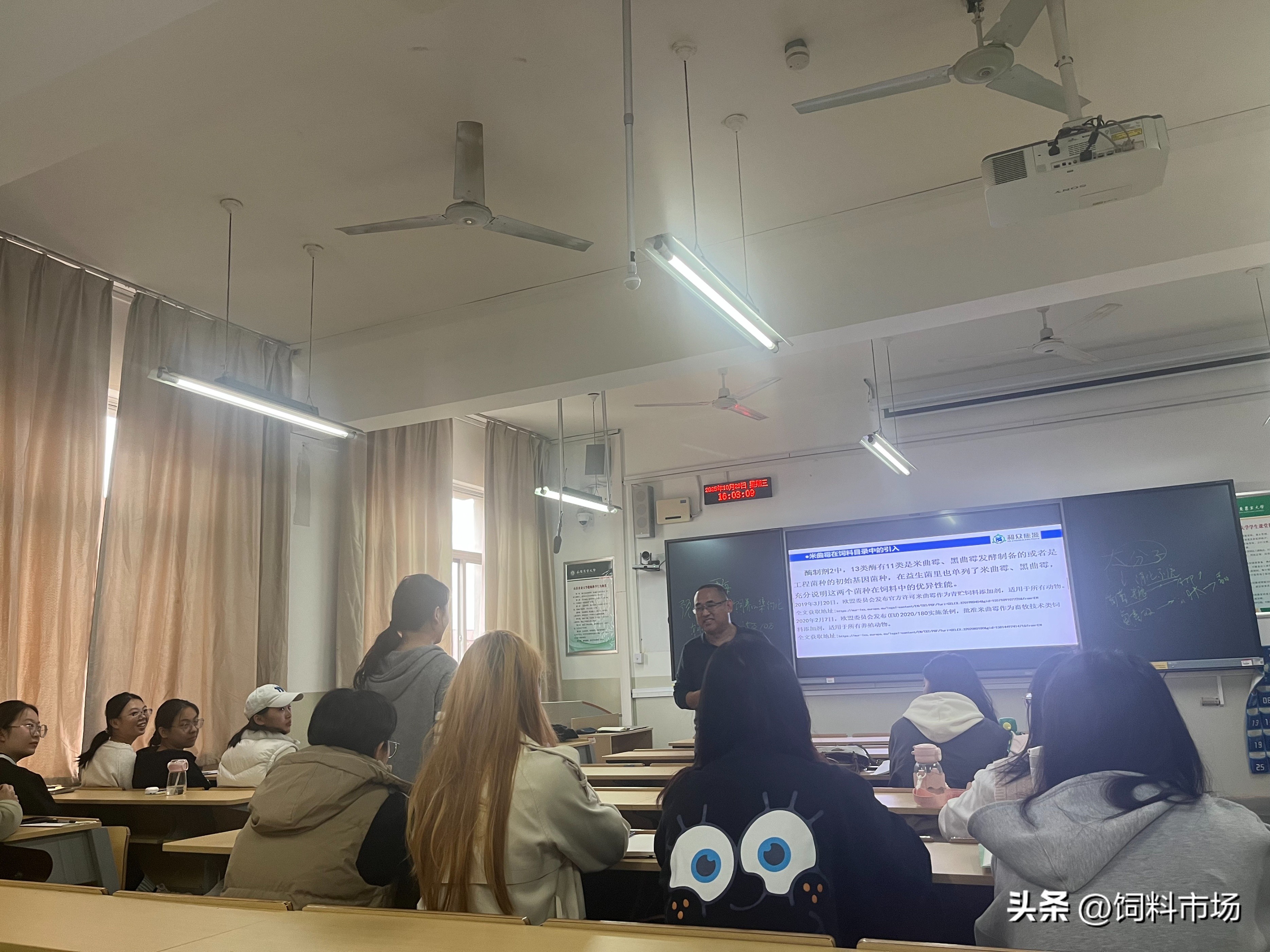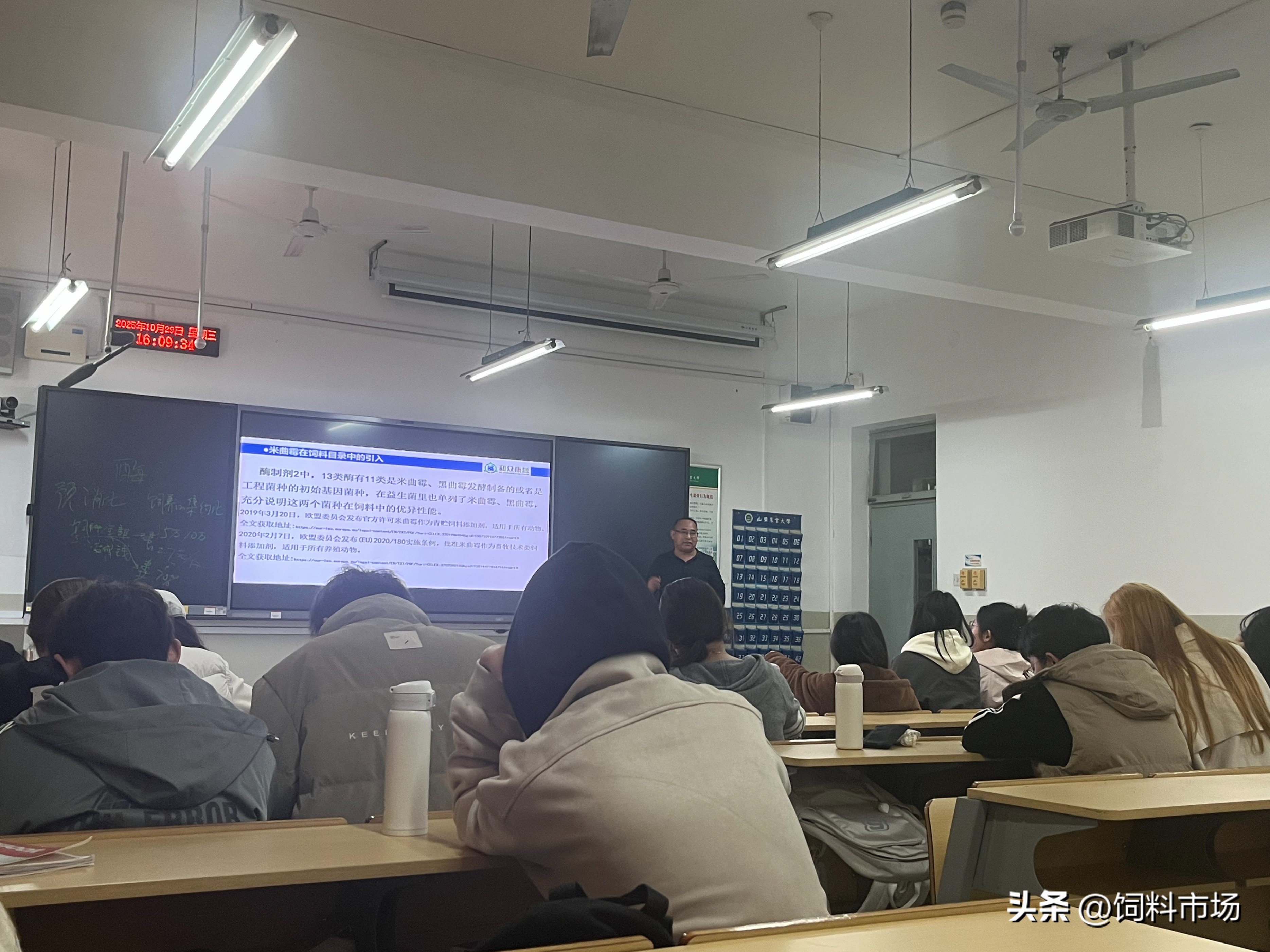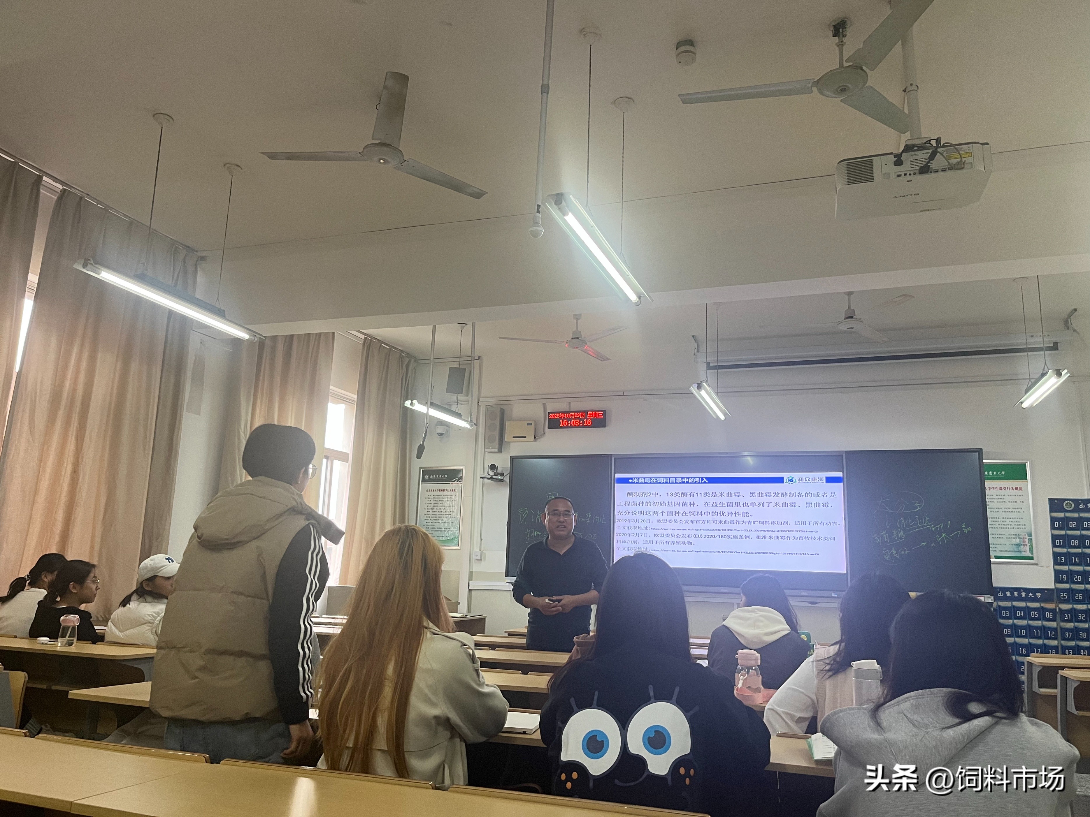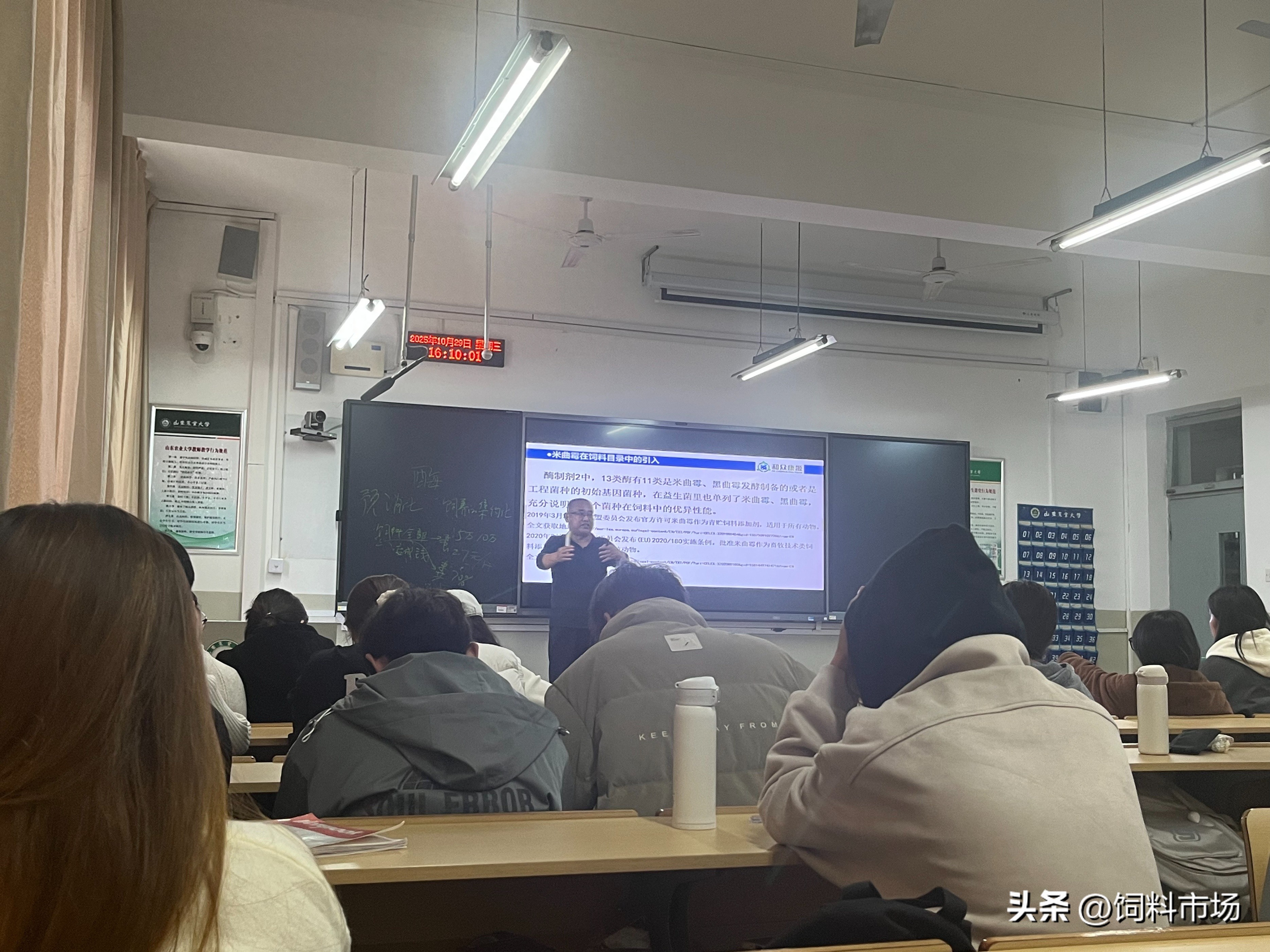 2025 年 10 月29 日下午,一场聚焦发酵饲料领域前沿实务的学术盛宴在山东农业大学生命科学学院圆满举行。山东畜牧兽医学会动物微生态学专业委员会副理事长王焕高研究员,应学院邀请,为微生物专业一年级硕士研究生带来题为《发酵饲料实务》的专题报告。报告会由山东农业大学孙中涛教授主持,30多名研究生现场聆听,共同探索发酵饲料产业的实践路径与发展前景。