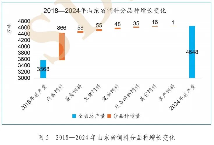 2018年以来,山东省饲料品类丰富,产品结构持续优化。总体表现为,肉禽饲料在总量较大的基础上持续增长,生猪饲料产量波动大,蛋禽饲料和反刍动物饲料稳中有增,水产饲料产量保持稳定,宠物饲料产量增长势头强劲。2024年全省饲料总产量比2018年增长1079.9万吨,其中肉禽饲料增长866.2万吨,占增量部分的80.2%;蛋禽饲料增长57.9万吨,占增量部分的5.4%;生猪饲料增长55.4万吨,占增量部分的5.1%;宠物饲料增长48.5万吨,占增量部分的4.5%;反刍动物饲料增长34.9万吨,占增量部分的3.2%;水产饲料增长1万吨,占增量部分的0.1%;其它饲料增长15.9万吨,占增量部分的1.5%。