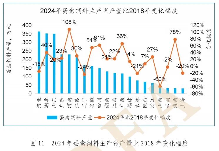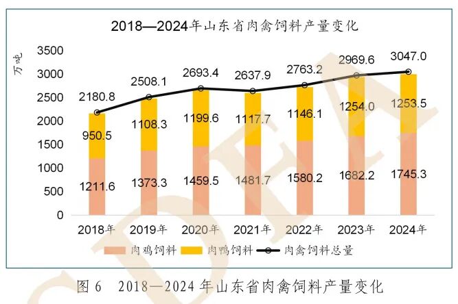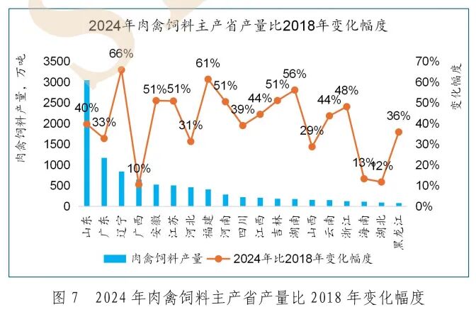 其中,2024年肉鸡饲料占比57.3%,2018年以来年均复合增长率6.3%; 肉鸭饲料占比41.1%,2018年以来年均复合增长率4.7%。山东省肉禽饲料产量已经自2006年以来连续19年保持全国第1位;近3年,占全国肉禽饲料比例基本稳定在30%左右。