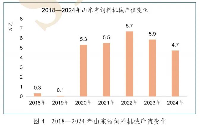 2024年山东省饲料添加剂产值269.2亿元,占全国饲料添加剂产值 20.5%,位居全国第1位,2019年以来占全国比例基本保持稳定;饲料机 械产值4.7亿元,占全国饲料机械产值7.1%,位居全国第2位,2018年以来占全国比例稳中有升。