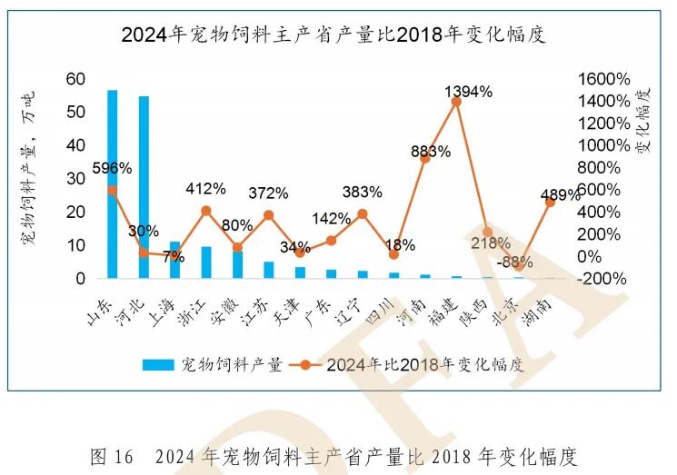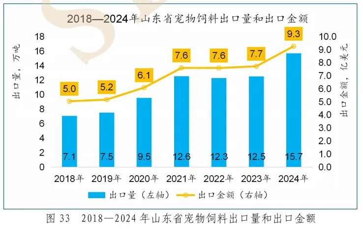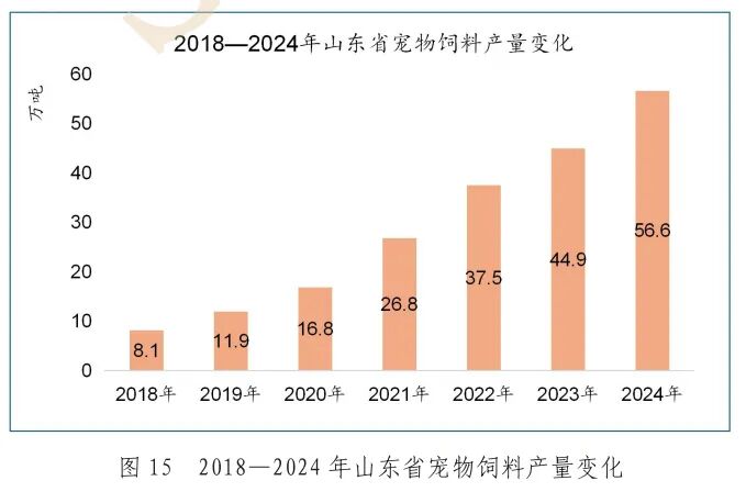 宠物饲料产量增长强劲。山东省宠物饲料企业数量多,产业规模大,已经成为全国宠物饲料的主产地。2018-2024年,山东省宠物饲料产量由8. 1万吨增长至56.6万吨,累计增长48.5万吨,增幅596%;2024年山东省宠物饲料产量位居全国第1位,占全国宠物饲料产量的35.4%。2024年山东省宠物饲料产值(不包括零食)84.8亿元,同比增长30%。