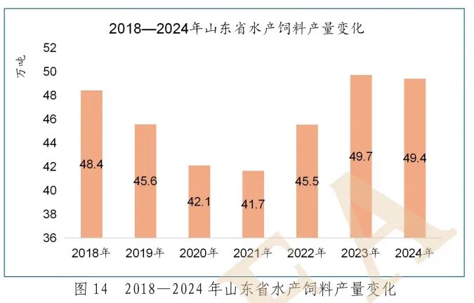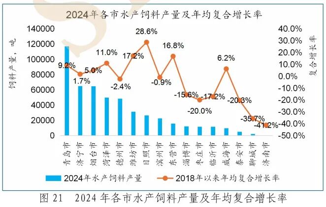 水产饲料区域集中度高。水产饲料生产主要集中在青岛市、济宁市、烟台市、菏泽市和德州市。2024年五市水产饲料产量占全省水产饲料的69 .9%,比2018年提高了16.5个百分点。