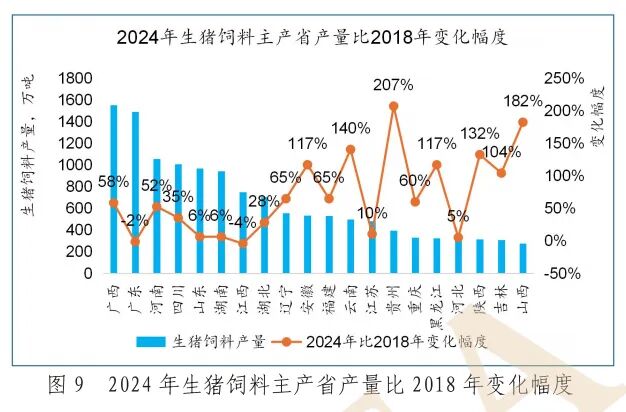 各市生猪饲料产量变化幅度较大。2024年 ,生猪饲料主要生产区域是临沂市、烟台市、潍坊市,三市生猪饲料产量占全省份额42.7%。同2018年相比,各市占全省份额提高的有烟台市、青岛市、菏泽市、德州市、泰安市、聊城市、滨州市、东营市、威海市、济宁市。这些市生猪饲料在全省份额提升的主要原因是,一是生猪一体化项目产能逐渐释放,饲料产量增幅较大;二是2022年以来,在生猪疫病防控、市场等多重因素作用下,开始出现“二次育肥”,后演变成“专业放养公司”模式,尤其在泰安市、烟台市、青岛市、威海市、临沂市等地出现了大量的专业育肥场,也促进了生猪饲料产量增长。