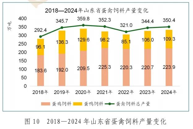 蛋禽饲料产量平稳增长。2018-2020年蛋禽养殖迎来超长盈利周期,推 动蛋禽存栏高位增长,2020年山东省蛋禽饲料产量359.8万吨,随后有所 回落,呈现高位波动。2024年山东省蛋禽饲料产量350.4万吨,2018年以来年均复合增长率3.1%,蛋禽饲料产量占山东省饲料总产量比例由8.2% 下降至7.5%。其中2024年蛋鸡饲料占比63.9%,2018年以来年均复合增长率3.4%;蛋鸭饲料占比31.1%,2018年以来年均复合增长率2.2%。近3年,山东省蛋禽饲料产量占全国蛋禽饲料比例基本稳定在10%左右。