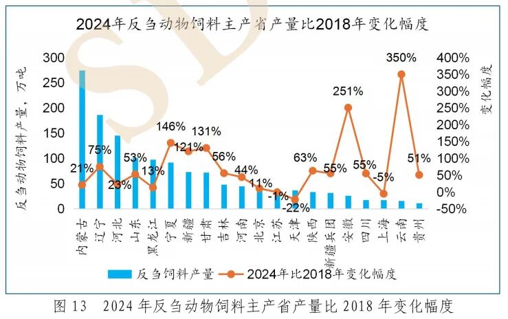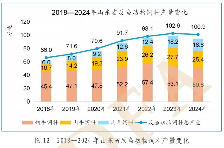 反刍动物饲料产量保持增长。2018年以来,肉牛、肉羊养殖规模扩大, 反刍动物饲料产量持续增长,2023年反刍动物饲料产量达到102.6万吨。 2024年牛羊养殖亏损,反刍料小幅回落。2018-2024年,山东省反刍动 物饲料产量由66.0万吨增长至100.9万吨,累计增长34.9万吨;反刍动物饲料产量占山东省饲料总产量比例由1.8%上升至2.2%。其中,2024年奶牛饲料占比50.1%,2018年以来年均复合增长率1.8%;肉牛饲料占比 25.1%,2018年以来年均复合增长率15.5%;肉羊饲料占比18.7%,2018年以来年均复合增长率21.1%。近3年,山东省反刍动物饲料占全国反刍动物饲料比例在6%-7%之间。