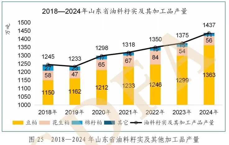 山东省地处黄渤海大豆压榨圈,大豆产量在60万吨左右,但大豆进口量大,山东省年产豆粕1300多万吨,在全国占比位居前列。山东省年产花生300万吨左右,花生粕季节性用量大。豆粕除本地使用外,还流向东北、华北、华中等区域。