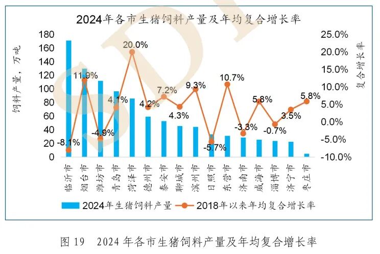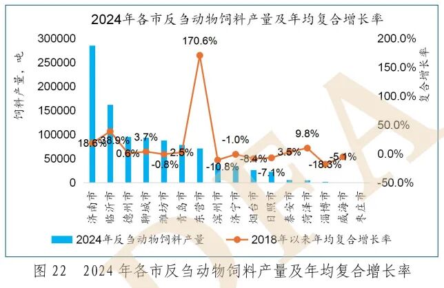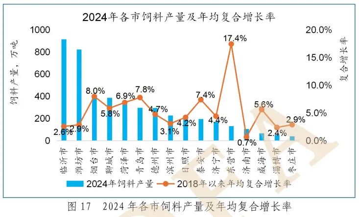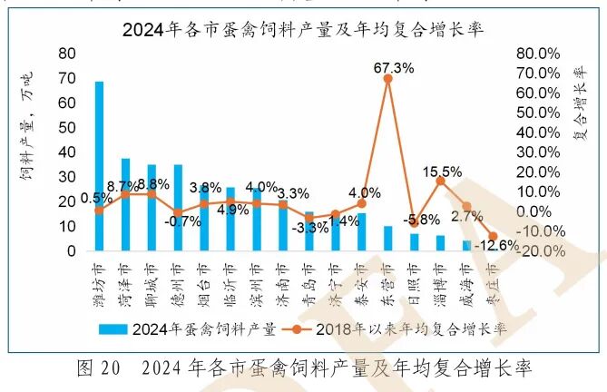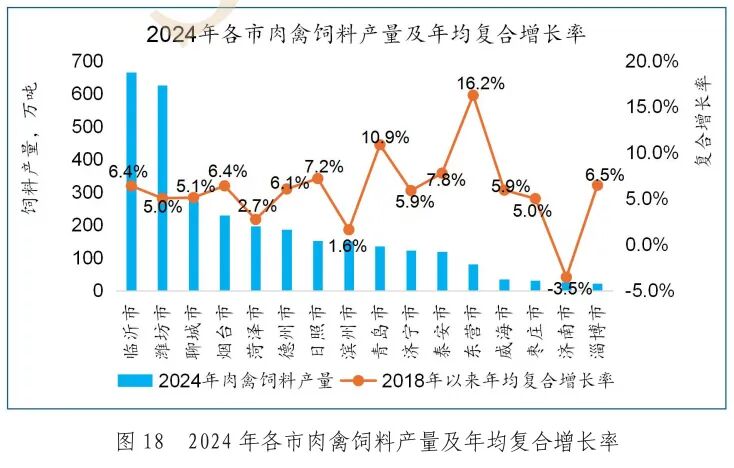 山东省饲料产业成熟,2018年以来各市饲料产值、产量份额变化不大, 但产品结构方面有一些调整。临沂市和潍坊市是山东省主要的饲料市场区 域,两市饲料产值产量占比38%,2024年比2018年下降2.4个百分点, 产值产量占比下降的主要原因是生猪饲料降幅较大;产值产量占比增长的主要是烟台市、菏泽市、青岛市、德州市和东营市,产值产量占比提升的主要原因是生猪饲料、肉禽饲料增长;东营市、烟台市、青岛市、泰安市、菏泽市、聊城市、威海市、德州市2018年以来饲料产量年均复合增长率高于全省平均水平。