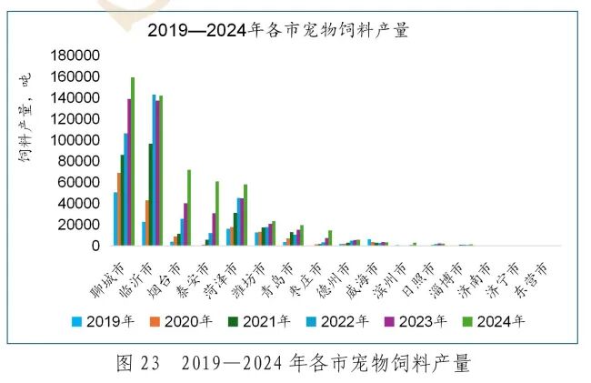 宠物饲料区域集中度高。 宠物饲料生产主要集中在聊城市、临沂市、烟台市、泰安市、菏泽市,这五市2024年宠物饲料产量占全省比例87.0%。临沂市、烟台市、泰安市发展速度快,青岛市和枣庄市也有加速。