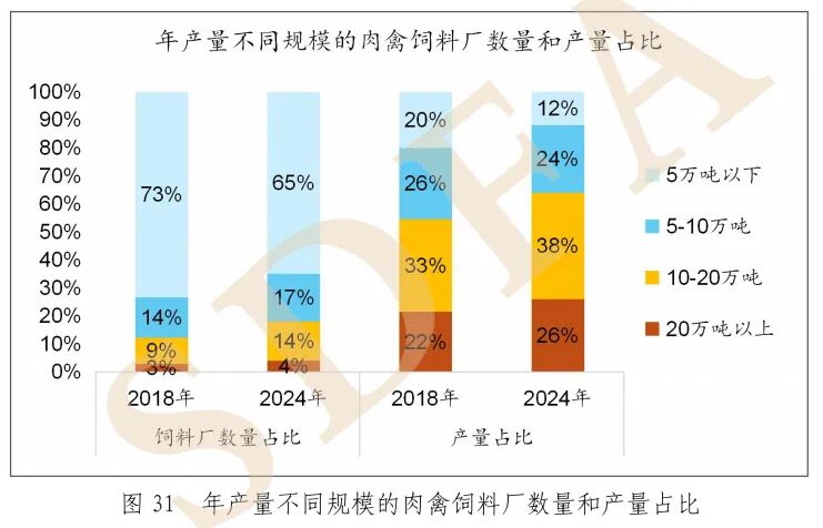 单厂规模扩大。 2024年山东省生产肉禽饲料的饲料厂(单厂)数量约600家,平均单厂年产量5万吨。其中单厂年产量20万吨以上的饲料厂数量25家,比2018年增加9家,饲料产量占全省肉禽饲料产量的26%,比2018年提高4.5个百分点;单厂年产量10万吨-20万吨的饲料厂数量86家,比2018年增加35家,饲料产量占全省肉禽饲料产量的38%,比2018年提高5个百分点;单厂年产量5万吨-10万吨的饲料厂数量105 家,比2018年增加27家,饲料产量占全省肉禽饲料产量的24%,比2018年降低1.5个百分点;单厂年产量5万吨以下的饲料厂数量约400家,同 2018年基本持平,饲料产量占全省肉禽饲料产量的12%,比2018年降低 8个百分点。