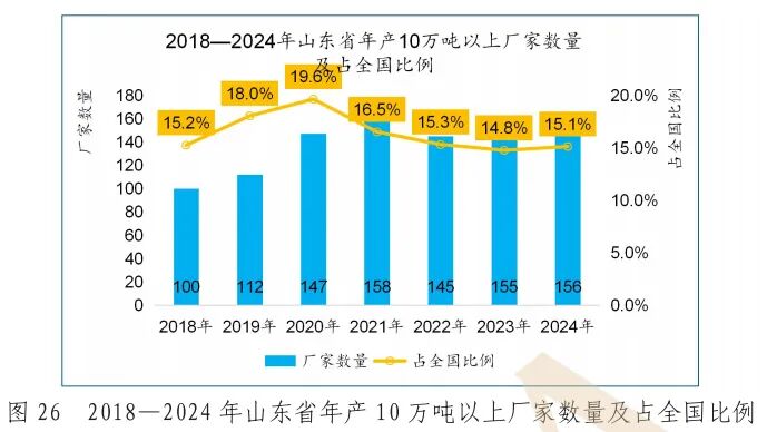 自2018年以来,山东省饲料生产企业集中度进一步提高,据统计, 2024年,全省饲料产量10万吨以上厂家数量156家,较2018年增加56 家;2024年饲料产量10万吨以上厂家数量占全国的15.1%,较2020年的 19.6%有所下降。