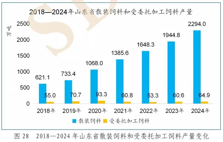 随着饲料市场竞争趋于激烈,为降低远途运输费用和充分利用产能,生产企业间的委托加工饲料产量保持小幅增长,但与山东配合饲料总量相比占比很小。2024年受委托加工饲料64.9万吨,比2018年增长10万吨,增幅18.0%,占全省饲料总产量的1.4%。