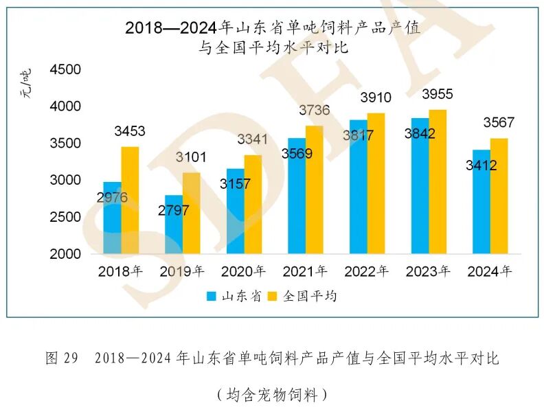 山东省玉米、豆粕价格同全国平均水平相近,主要原料成本与全国相比,优势并不明显;同时,山东省饲料市场竞争激烈,企业持续提高工厂运行效率、控制生产成本,通过散装饲料、大客户直销等方式,降低营销费用;为保障销量和市场占有率,维持低水平毛利;另外,同全国相比, 山东省饲料产品猪、禽生长育肥阶段饲料占比高,而毛利相对较高的幼畜 禽料、水产饲料等占比较低。以上这些因素造成山东省平均饲料吨产值于全国平均水平。