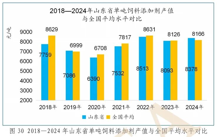 饲料添加剂产品价格受竞争格局、国际市场出口需求和国内需求等影响因素较大,产品价格和产值波动大。2018年以来,山东省维生素E 、蛋氨酸、维生素B6 等价格、价值较高的饲料添加剂产品占比逐步扩大,饲料添加剂平均单吨产值同全国平均水平接近。