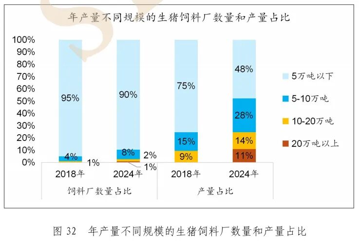单厂规模偏低。2024年山东省生产生猪饲料的饲料厂(单厂)数量约500家,比2018年减少近100家。平均单厂年产量2万吨左右。其中单厂年产量20万吨以上的饲料厂数量4家,比2018年增加4家,饲料产量占全省生猪饲料产量的11%,比2018年提高11个百分点;单厂年产量10万吨-20万吨的饲料厂数量9家,比2018年增加3家,饲料产量占全省生猪饲料产量的14%,比2018年提高5个百分点;单厂年产量5万吨-10万吨的饲料厂数量37家,比2018年增加14家,饲料产量占全省生猪饲料产量的28%,比2018年提高13个百分点;单厂年产量5万吨以下的饲料数量超过400家,比2018年减少100家以上,饲料产量占全省生猪饲料产量的48%,比2018年降低28个百分点。