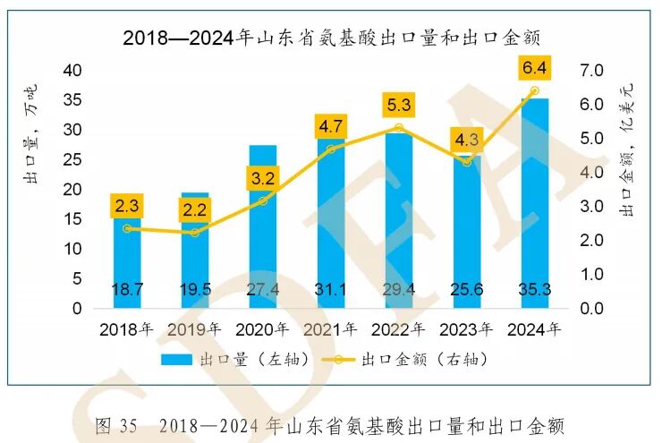 2024年山东省氨基酸类产品(固体蛋氨酸、赖氨酸盐酸盐、苏氨酸等)出口量35.3万吨,全国排名第3位,占全国出口量的16.9%; 出口金额6.4亿美元,全国排名第2位,占全国出口金额的19.6%;平均出口单价1816美元/吨,比全国平均水平高16.0%,主要是蛋氨酸占比高。2018年以来出口量年均复合增长率11.2%,比全国平均水平低3.7个百分点,出口量占全国份额从2018年的20.6%下降至2024年的16.9%,主要原因是东北地区赖氨酸盐酸盐产能扩张和出口势头强劲。