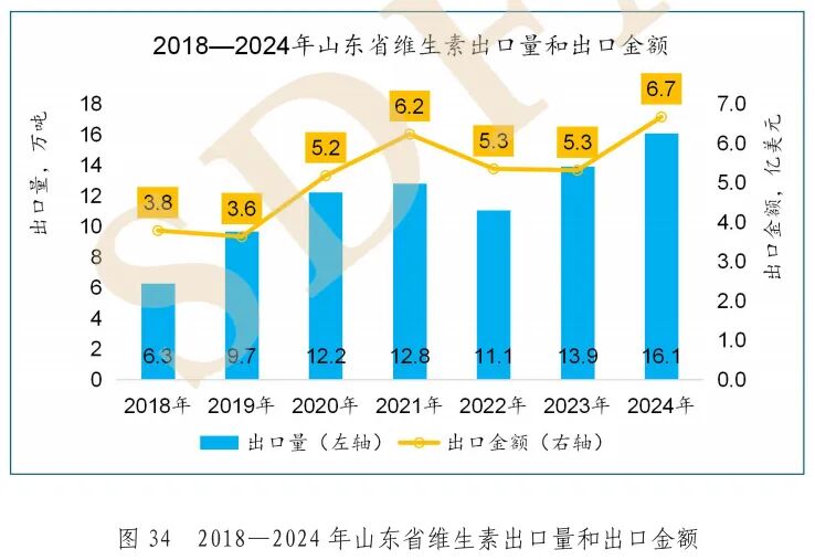 2024年山东省维生素类产品(不含氯化胆碱粉剂)出口量16.1万吨,全国排名第1位,占全国出口量的31.7%;出口金额6.7亿美元,全国排名第2位,占全国出口金额的19.0%;平均出口单价4144美元/吨,比全国平均水平低40.1%,主要是单价较低的维生素C、氯化胆碱水剂等占比高。2018年以来出口量年均复合增长率17.0%,比全国平均水平高9.8个百分点,出口量占全国份额从2018年的18.7%提升至2024年的31.7%,主要是部分维生素新建、扩建项目逐渐投产,产能、产量和出口增长。