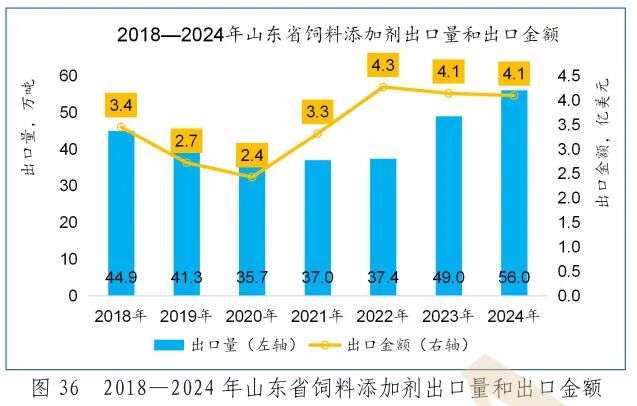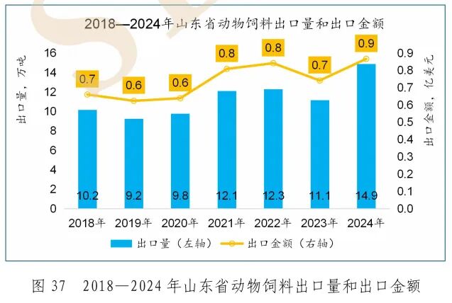 山东省是饲料和饲料添加剂出口大省,附加值较高的宠物饲料、维生素、氨基酸、饲料添加剂、动物源性饲料等产品出口量、出口金额在全国领先。 据海关数据统计(按海关编码),2024年上述5类产品出口量138.0万吨, 占全国出口量的29.9%,2018年以来年均复合增长率8.0%,比全国平均水 平低2.2个百分点;出口金额27.3亿美元,占全国出口金额的27.9%, 2018年以来年均复合增长率10.2%,比全国平均水平高4.0个百分点。