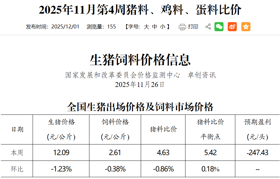 11月第4周(以下称为本周)全国猪料比价为4.63,环比下跌0.86%。按目前价格及成本推算,未来仔猪育肥模式的生猪养殖头均亏损为247.43元。本周生猪均价环比下滑。