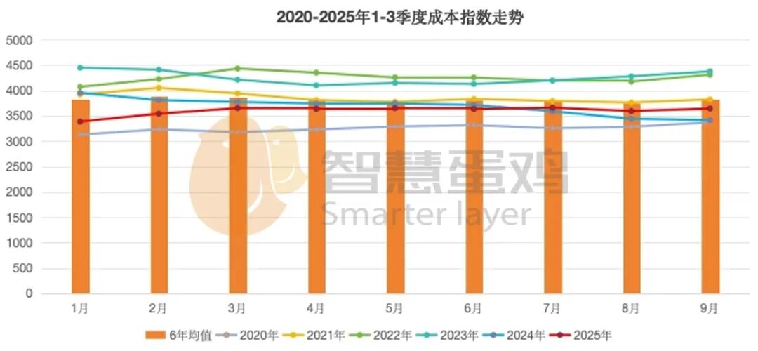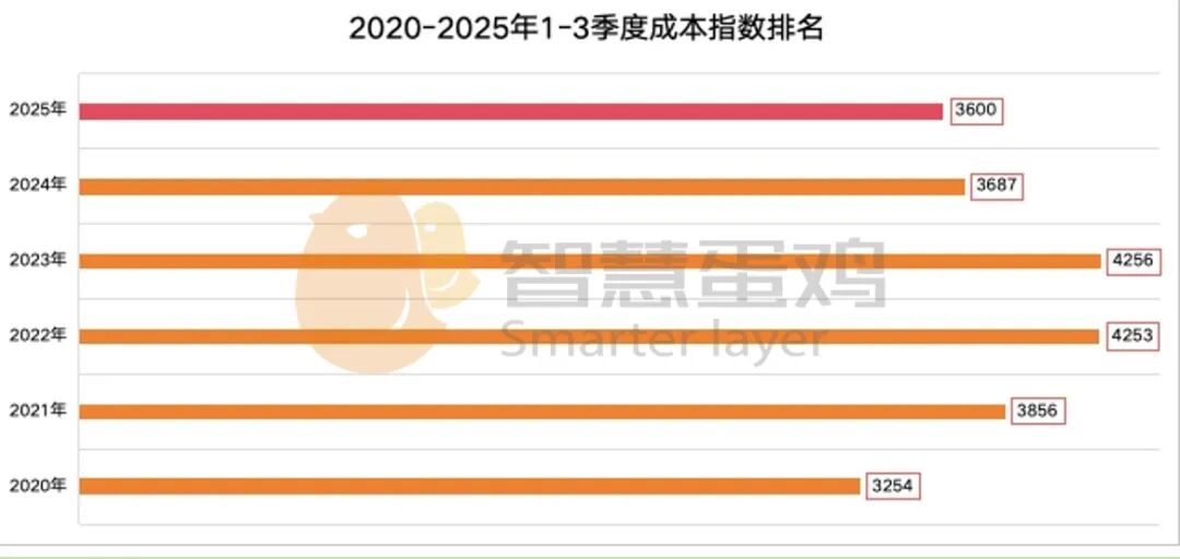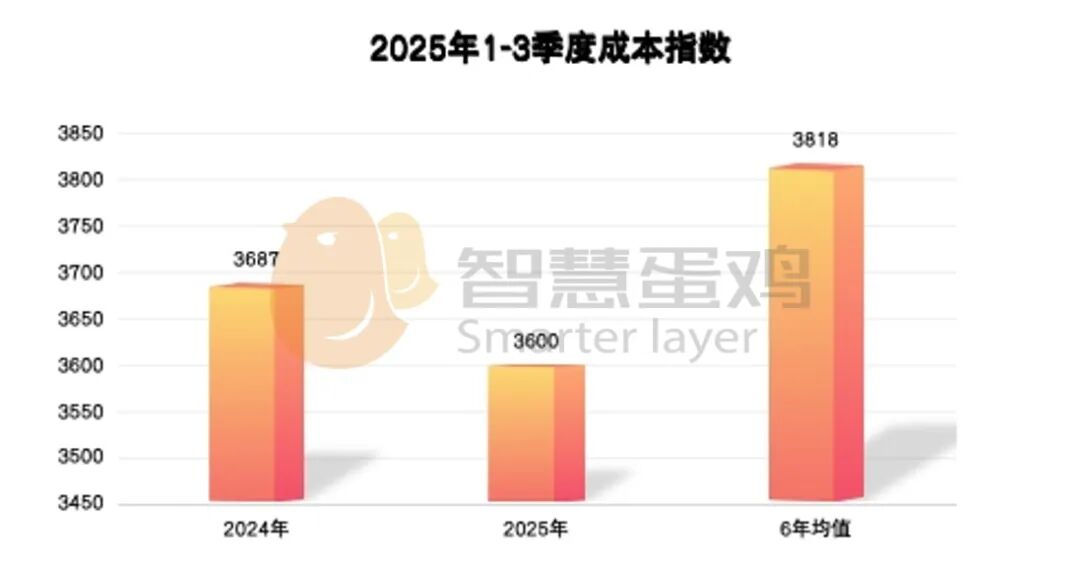 2025年1-3季度,全国平均成本指数为3600点,较去年同期的3687点,下降87点,降幅为2.36%;较近6年同期成本指数均值3818点,下降218点,降幅为5.71%。