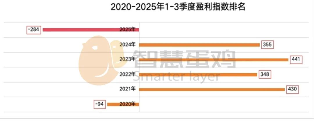 2025年1-3季度,全国平均盈利指数为-284点,较去年同期的355点,下降了639点,降幅为180.00%;较近6年同期盈利指数均值199点,下降了483点,降幅为242.71%。