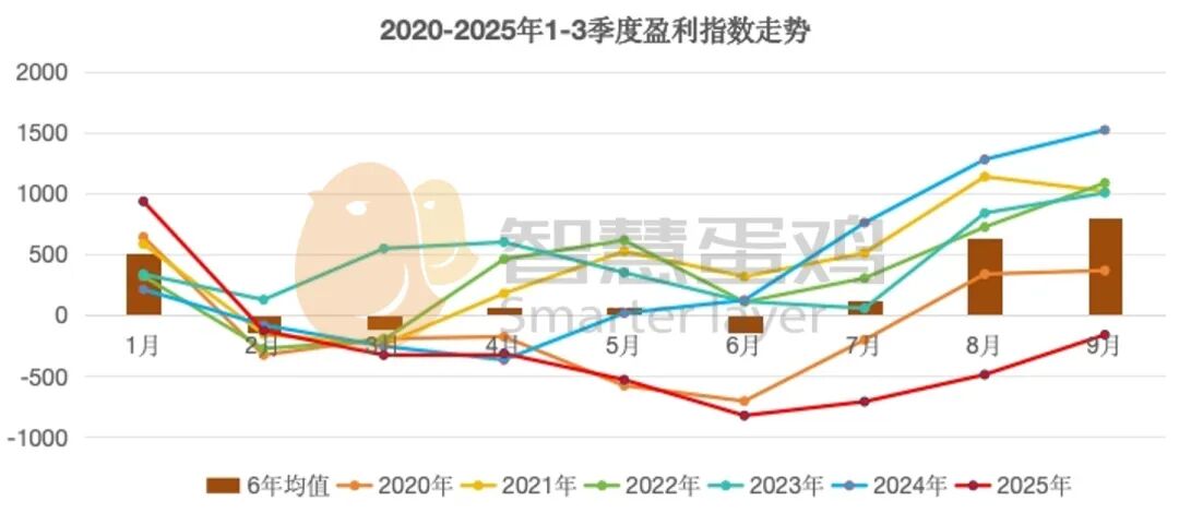 2025年1-3季度盈利指数整体变化趋势,与近六年同期月度盈利指数均值比较,趋势大体一致。但2025年三季度平均平均盈利处于亏损区间是近六年首次。