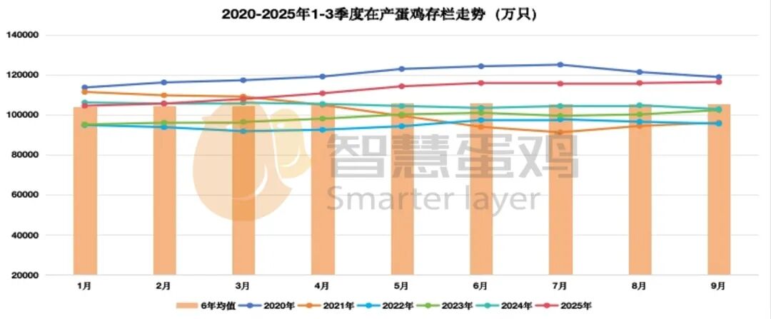 2025年1-3季度,全国在产商品代蛋鸡月均存栏(理论值)11.16亿只,较去年同期的10.47亿只,上涨了0.69亿只,涨幅为6.59%,较近六年同期
