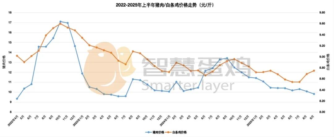 从相关替代品的角度看,2025年1-3季度猪肉、白条鸡等动物性替代品价格低迷 ,猪肉价格同比下降8.83%,白条鸡价格同比下降1.44%,对鸡蛋价格的支撑作用减弱。