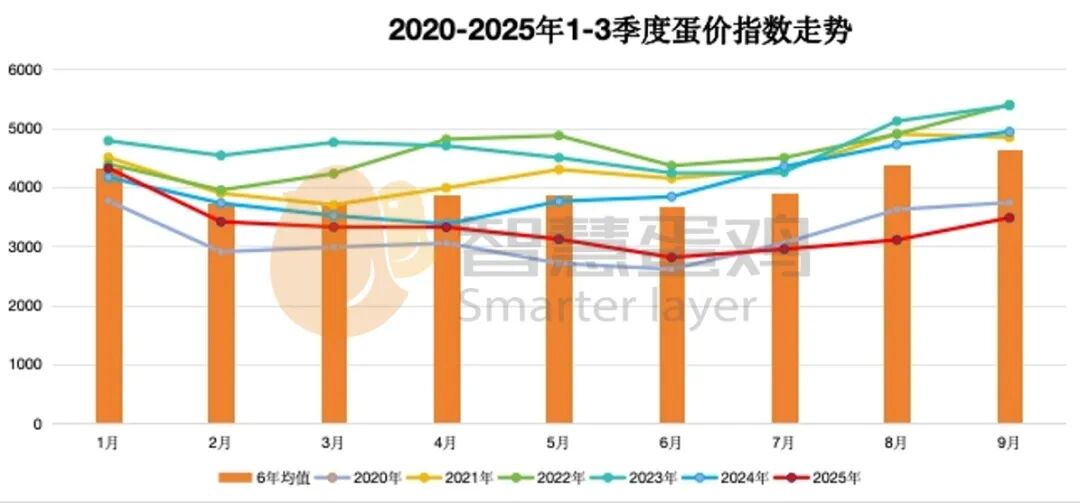 2025年1-3季度蛋价指数走势,与近六年同期月度蛋价指数走势基本相符,但2025年3季度蛋价上涨动力不足,蛋价涨幅较小,呈现“旺季不旺”的特征。