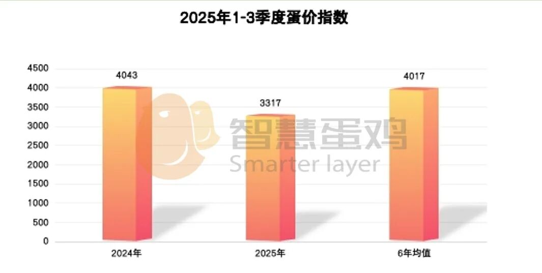 2025年1-3季度,全国平均蛋价指数为3317点,较去年同期的4043点,下降726点,降幅为18.00%;较近6年同期蛋价指数均值4017点,下降了700点,降幅为17.4%。
