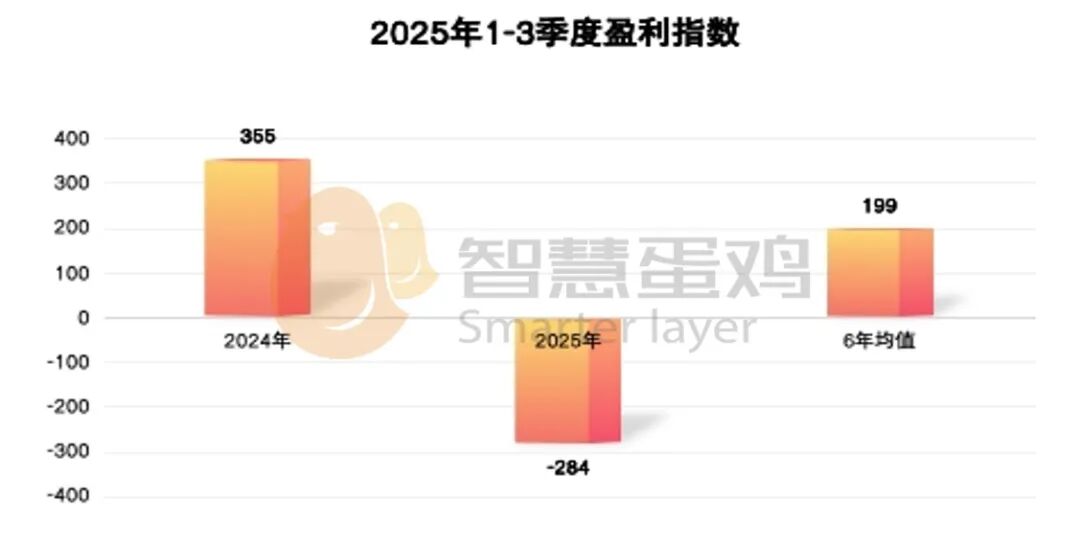 2025年1-3季度,我国蛋鸡市场呈现供应过剩、价格低迷、利润压缩的显著特征,行业运行陷入近六年低谷。从核心指标看,蛋价指数上涨动力持续匮乏, 在3季度蛋鸡市场旺季也未能呈现传统旺季的回升态势;商品蛋鸡养殖端持续亏损,1-3季度月均亏损达 0.28 元 / 斤,创近六年同期最低水平。