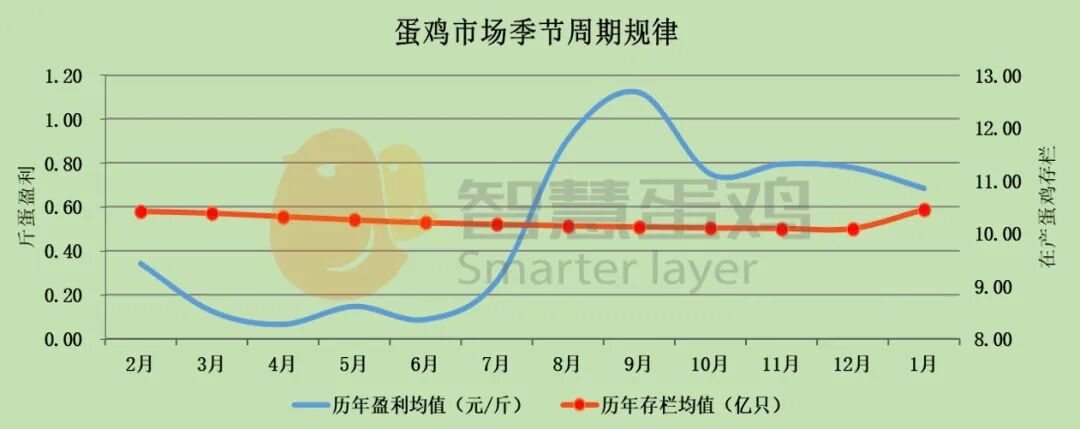 历史数据显示,在年内各月在产蛋鸡存栏差异很小的情况下,年内各月平均斤蛋盈利水平差异巨大。正常情况下,1-2季度是蛋鸡行业淡季,鲜蛋需求相对较少,对蛋价的支撑作用较弱,鲜蛋盈利水平较低;3-4季度是蛋鸡行业的旺季,鲜蛋需求较多,对蛋价的支撑作用较强,鲜蛋盈利水平较高。