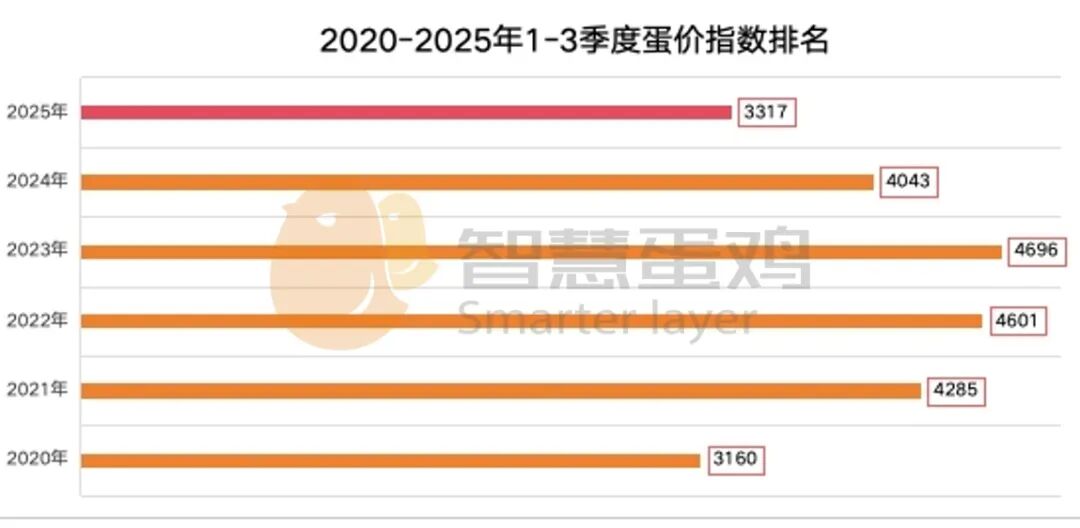 与近六年1-3季度蛋价指数比较,2025年1-3季度蛋价指数属于低位区间,位于近六年第二低位。
