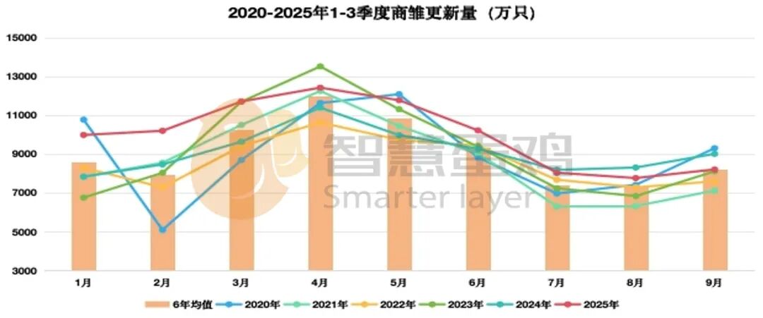 蛋鸡行业周期是由前期商雏补栏数量和后期在产蛋鸡存栏水平所决定的。2025年1-3季度,全国商雏月均补栏量10027万只,较去年同期的9113万只,增加914万只,增幅为10.03%;较近六年同期的9099万只,增加928万只,增幅为10.20%;商雏月均补栏量位于近六年第一高位。