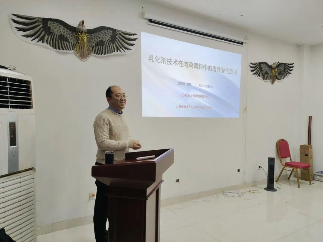 公司特邀山东农业大学宋志刚教授做 “乳化剂技术在肉鸡饲料中的增效替代应用”的专题报告,他通过对比实验数据,清晰呈现了乳化剂产品在降低饲料成本、提升饲料转化率、改善肉鸡生产性能等方面的显著成效,结合实际合作案例拆解推广要点,为销售团队在相关领域的市场攻坚提供了有力的技术背书与实战思路。