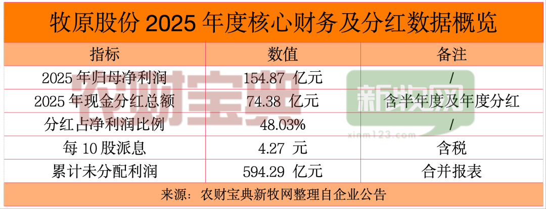 值得注意的是,若将本次年度分红与2025年半年度已实施的50.02亿元利润分配合并计算,牧原股份2025年度的现金分红总额将达到74.38亿元。这一数字占到了公司本年度归属于母公司股东净利润的48.03%,接近半数,体现了公司“高分红”的诚意。