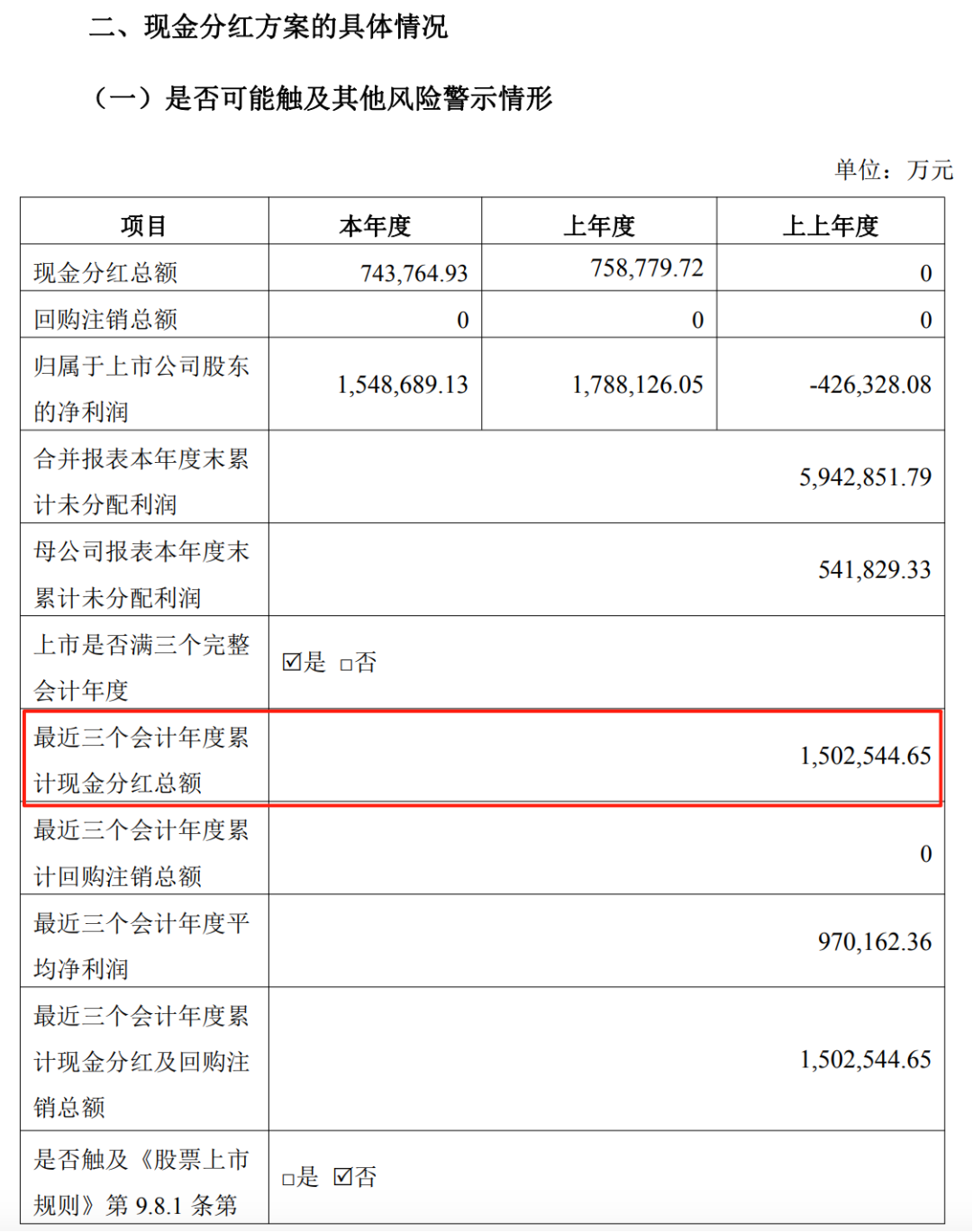 根据监管规则测算,公司最近三个会计年度累计现金分红总额为150.25亿元,高于最近三个会计年度年均净利润的30%。因此,公司明确表示,未触及《深圳证券交易所股票上市规则》中关于实施其他风险警示(ST)的相关规定,财务基本面保持稳健。